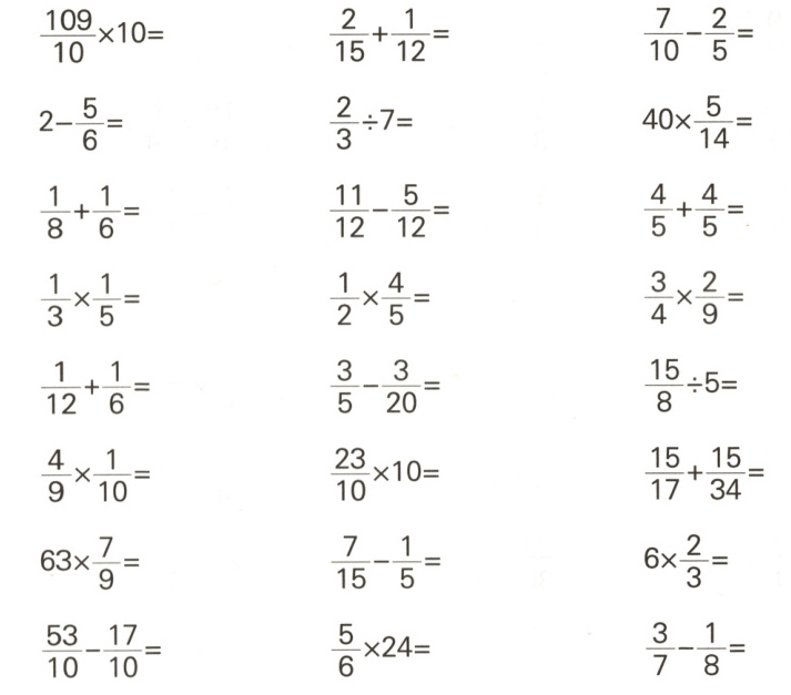 109 $\frac{7}{6}$ $\frac{1}{24}$ $\frac{1}{15}$ $\frac{1}{4}$ $\frac{2}{45}$ 49 $\frac{18}{5}$ $\frac{13}{60}$ $\frac{2}{21}$ $\frac{1}{2}$ $\frac{2}{5}$ $\frac{9}{20}$ 23 $\frac{4}{15}$ 20 $\frac{3}{10}$ $\frac{100}{7}$ $\frac{8}{5}$ $\frac{3}{6}$ $\frac{3}{8}$ $\frac{45}{34}$ 4 $\frac{17}{56}$
