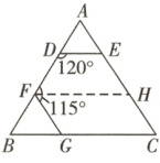 15. [几何模型](徐州中考)如图,在$\triangle ABC$中,若$DE// BC$,$FG// AC$,$\angle BDE = 120^{\circ}$,$\angle DFG = 115^{\circ}$,则$\angle C =$________.