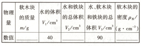 (3)同学们经过评估交流后,发现干软木块具有吸水性,则所测密度应______(填“大于”“等于”或“小于”)实际密度。同时改进了上述实验步骤:如上述步骤中用调好的天平测出软木块的质量m,在量筒中装入适量的水V₁后,用钢针将软木块浸没在水中,过段时间后读出水面对应的示数为72 cm³,将软木块从量筒中取出,擦去软木块表面的水后,测出其质量是28 g,这样测出的软木块的密度是______。
