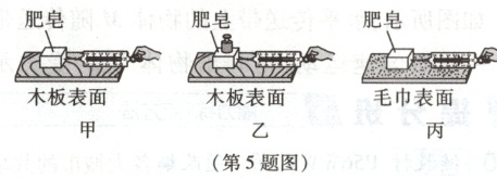 5. 小伟利用木板、毛巾、砝码、细线、弹簧测力计和长方体肥皂,进行“探究影响滑动摩擦力大小的因素”的实验,如图所示。