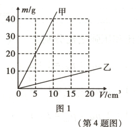 4 [2022·陕西汉中模拟]甲、乙两种物质的质量与体积关系如图1所示。若用甲、乙两种物质分别制成高度相同的A、B两实心圆柱体,如图2所示,则它们对水平地面的压强之比pₐ : pᵦ为( )
