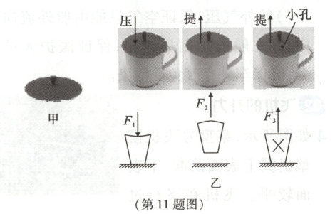 11. (核心素养·科学思维)小晴家有一款用软橡胶材料制作的茶杯盖,如图甲所示。小晴发现,将其盖在空茶杯杯口,先轻轻下压,再向上提起时,茶杯随杯盖也会一同被提起;如果在软橡胶盖上打一个小孔,则不能提起空茶杯。小晴的发现过程和示意图如图乙所示,请你用所学物理知识解释小晴发现的现象。