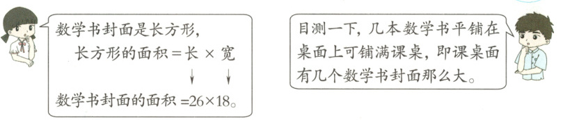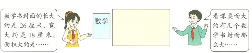 理解题意 从题目中可知:数学书封面的长大约是26厘米,宽大约是18厘米。要求的问题:(1)数学书封面的面积大约是多少平方厘米?(2)利用数学书封面的面积估测课桌面的面积。