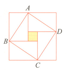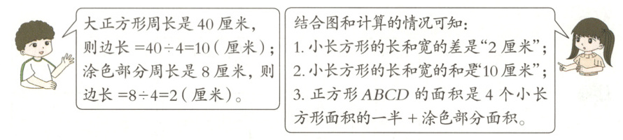 例题 如图是由四个相同的小长方形拼成的一个大正方形,大正方形的周长是40厘米,中间涂色部分也是正方形,它的周长是8厘米。正方形ABCD的面积是多少?