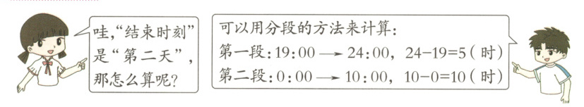 开始时刻和结束时刻不在同一天内,计算经过的时间,可以用24时作为前一天结束时刻和后一天开始时刻,把经过的时间分两段(两天)分别求出每段用时,再相加。