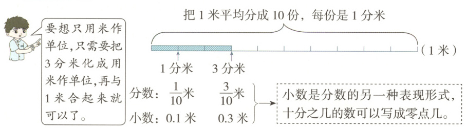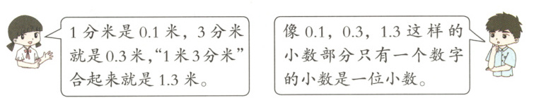 小数点左边的数表示“整米数”,即1米;小数点右边数位上的数字表示比1米小的量,即分米。3分米=0.3米,“3”写在小数点的右面。