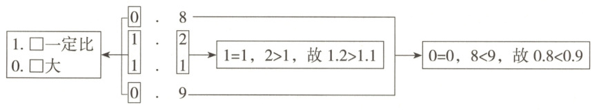 比较小数大小的方法:先比整数部分,整数部分大,小数就大;整数部分相同,比小数部分,小数部分第一位上的数字大的那个小数就大;如果第一位上的数相同就比较第二位上的数……以此类推。