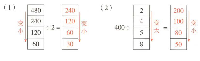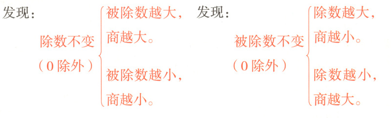 在除法算式中,如果被除数不变,除数越大,商越小;除数越小,商反而越大。如果除数不变,被除数越大,商越大;被除数越小,商越小。(被除数、除数均不为0)