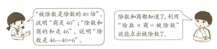 例2 在一道没有余数的除法算式里,被除数是除数的40倍,除数和商的和是46,被除数是多少?