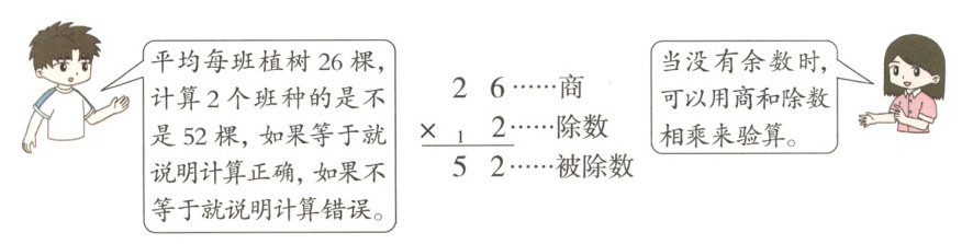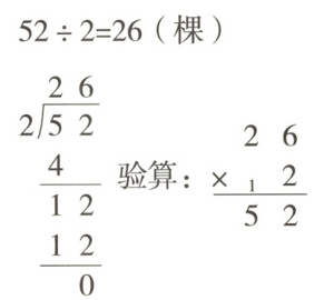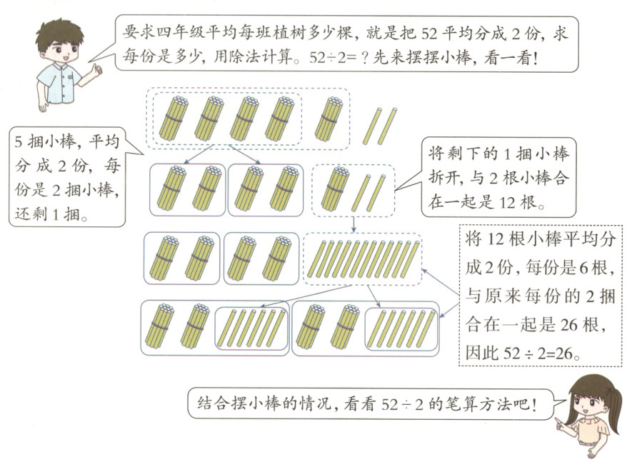 问题呈现 四年级2个班一共植树52棵,平均每班植树多少棵?(教材18页例2)