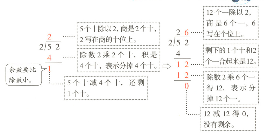 位上的数不能被一位数整除时,被除数十位上的数除以一位数后,余下