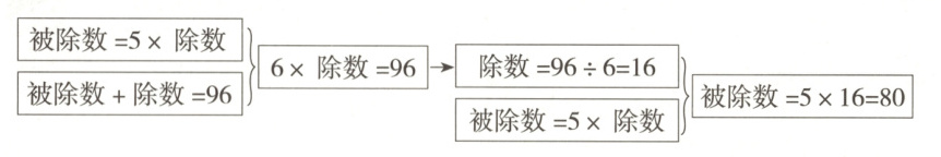 例题 两数相除,商是5,没有余数,除数和被除数的和是96。除数和被除数各是多少?