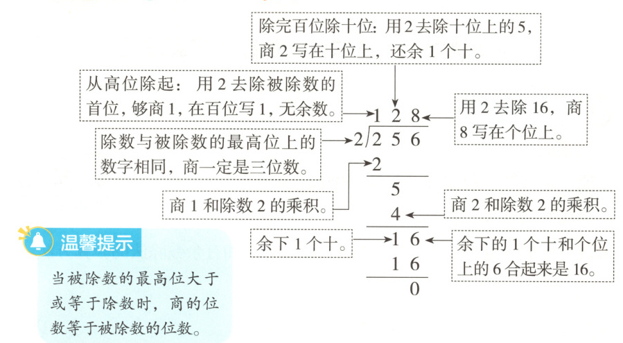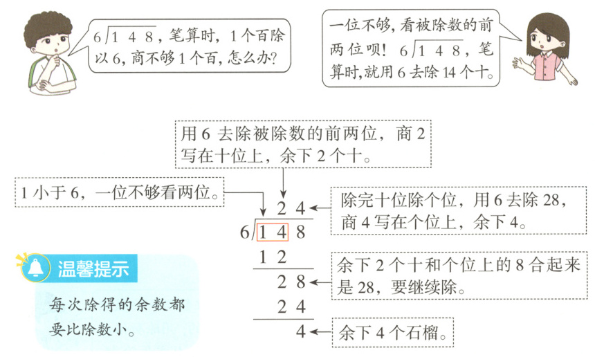 重点 掌握一位数除三位数的笔算方法及算理和有余数除法的验算方法。