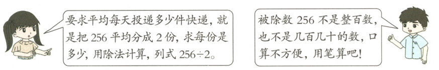 问题呈现 一名快递员2天投递了256件快递,平均每天投递多少件?(教材19页例3)