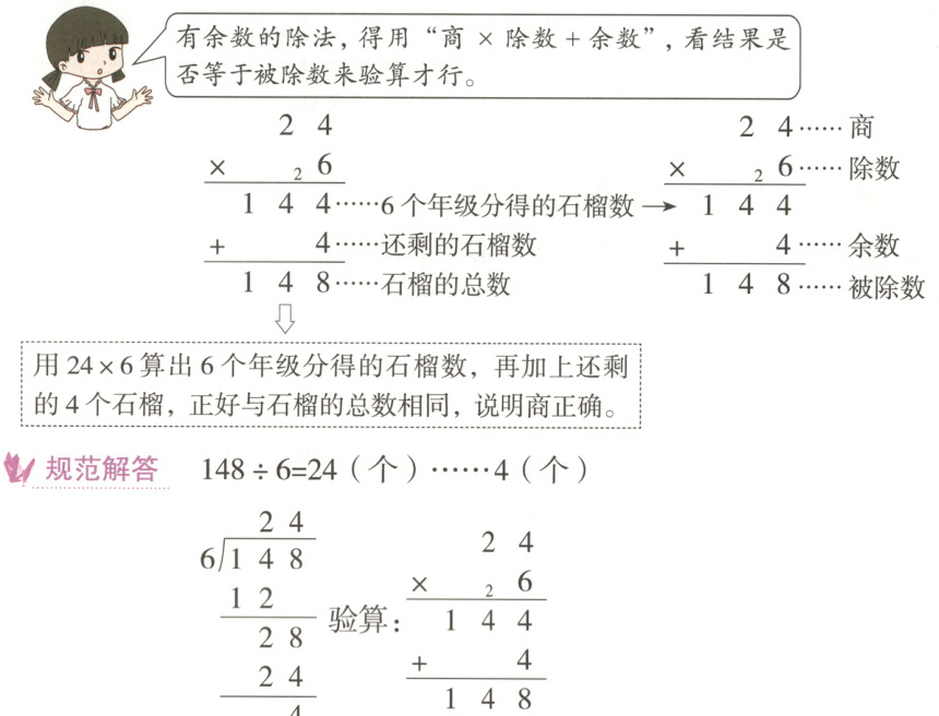 问题呈现 学校的石榴树结了148个石榴,平均分给6个年级。每个年级分得多少个,还剩几个?(教材19页例4)