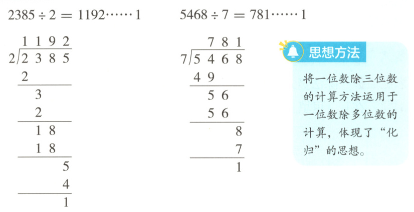 将一位数除三位数的计算方法运用于一位数除多位数的计算,体现了“化归”的思想。