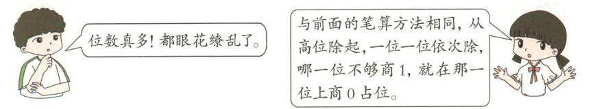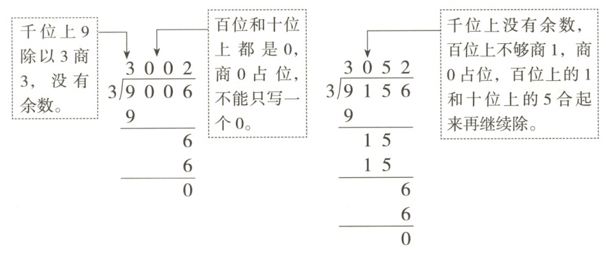 被除数中间某一位不够除时,应商0占位,并且把这一位上的数落下来和下一位上的数合起来继续除。