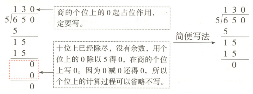 方法总结 三位数除以一位数,被除数的末尾有0,且前一位正好除尽没有余数,这一位的商就是0,在这一位上商0占位。