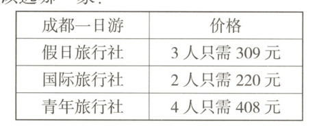 例题 下面是几家旅行社推出的“成都一日游”的旅游项目,万老师准备选择人均价格最便宜的旅行社参加成都一日游,请你帮他选择,应该选哪一家?