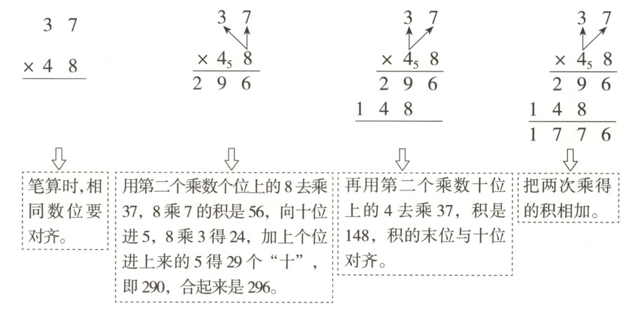 2.用第二个乘数每一位上的数分别去乘第一个乘数,用哪位上的数去乘,积的末位就和那一位对齐,哪位乘得的积满几十,就向前一位进几;