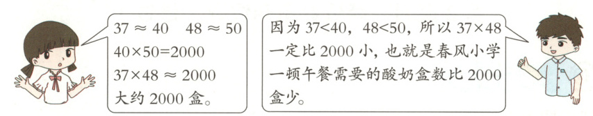 问题呈现 某小学有48个班,平均每班有37人。午餐时要为每人发一盒酸奶,一共需要多少盒酸奶? (教材43页例2)