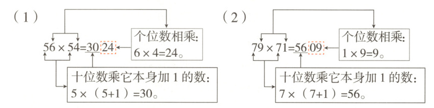 像这样的情况,我们把它叫做“头同尾合十”的乘法。数字特别,计算方法有什么特别吗?