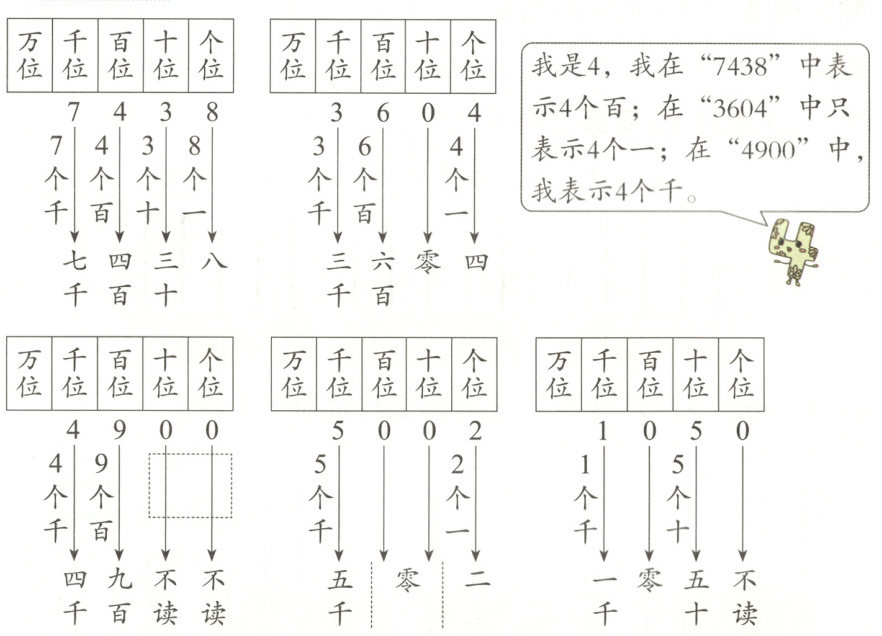 例3 读出下面各数,再说说它们分别是由几个千、几个百、几个十和几个一组成的。(教材83页第1题)