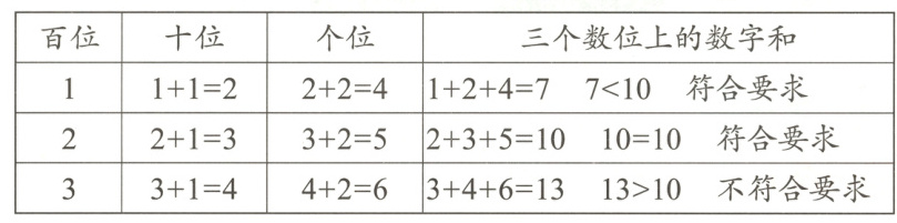 例2 一个三位数,它十位上的数字比个位上的数字小2,比百位上的数字大1,三个数位上的数字的和不超过10。这个三位数可能是多少?
