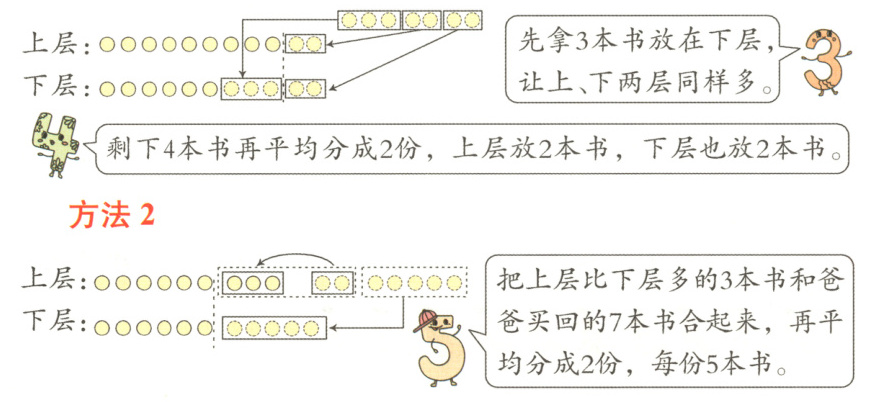 例2 书架的上层放了9本书,下层放了6本书。爸爸买回7本书,怎样放才能使上、下两层的书同样多?