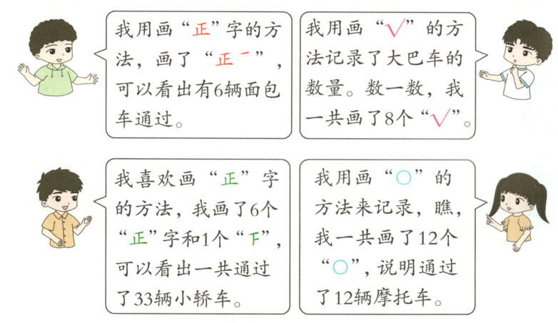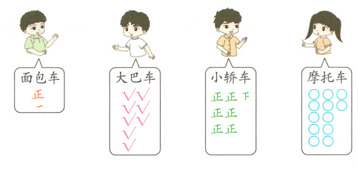 例2 几个同学正在统计一个路口10分钟内所通过的各种交通工具的数量。