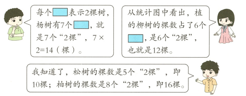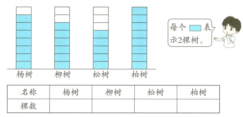 例1 下面是实验小学二(1)班同学植树情况。几种树分别植了多少棵?把结果填入下表中。