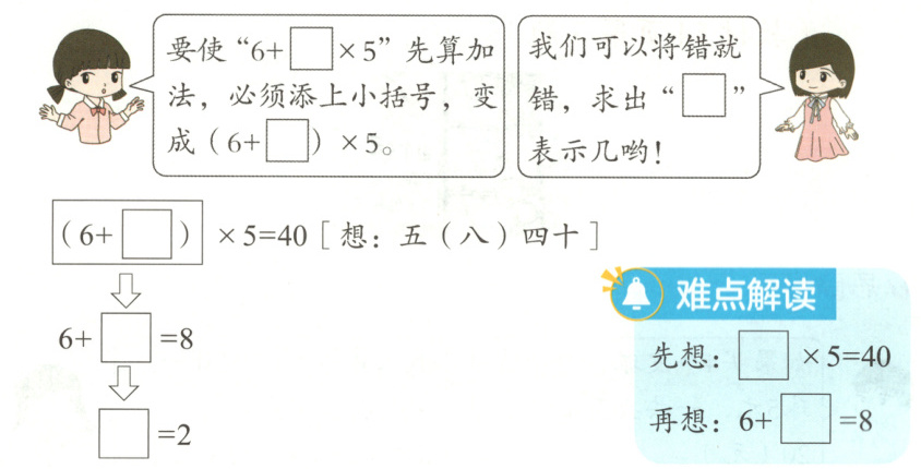 例1 小明在计算“6 + □×5”时弄错了运算顺序,先算加法后算乘法了,结果得数是40。正确的得数是多少?(教材56页第4题)
