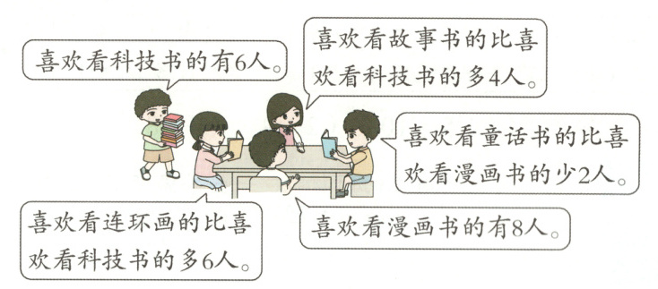 (3)喜欢看科技书和喜欢看童话书的人数相同。(答案不唯一)