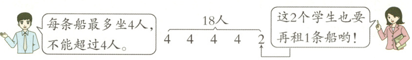 例1 18个学生去划船,每条船最多坐4人。他们至少要租多少条船?