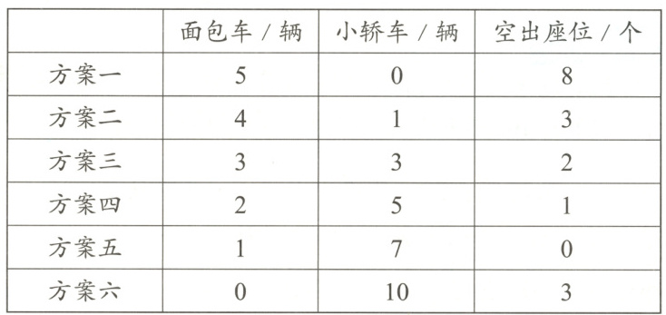 从上表可以看出,派1辆面包车和7辆小轿车,没有多余的座位,这种方案最合理,