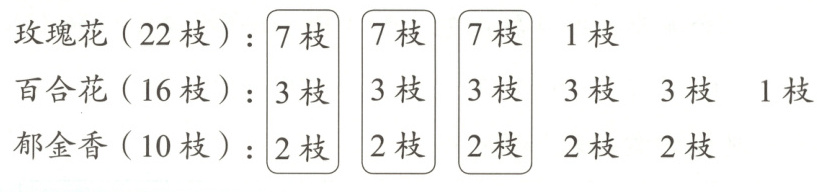 玫瑰花:22÷7 = 3(束)……1(枝)