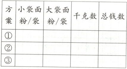 方案 小袋面粉/袋 大袋面粉/袋 千克数 总钱数