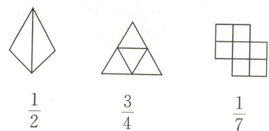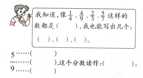 分数 $\frac{4}{5}$ $\frac{7}{8}$ $\frac{3}{11}$(答案不唯一) 分子 分数线 分母 九分之五
