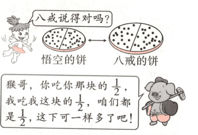 答:八戒说得不对。因为这两块饼不一样大,它们的$\frac{1}{2}$也就不一样大。