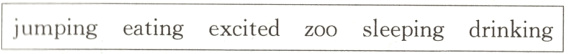 zoo; drinking; jumping; sleeping; eating; excited