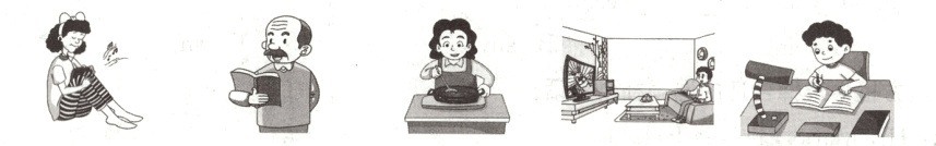 1.She is doing morning exercises. 2.Yes,she is. 3.At 12:00. 4.She is reading stories.