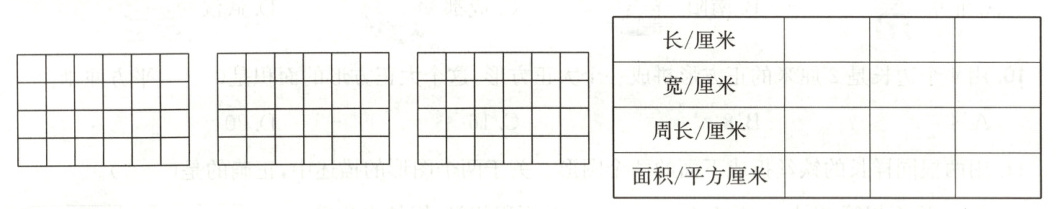 18. 先在下面的方格图上画出三个周长为 12 厘米的长方形(边长为整厘米数),再填一填。(每个小方格的边长为 1 厘米)(5 分)