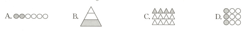 11. 下列图形中,涂色部分不能用$\frac{1}{3}$表示的是( )。