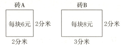 $4×3 = 12$(平方米) 12平方米 = 1200平方分米 砖A:$2×2 = 4$(平方分米) $1200÷4×6 = 1800$(元) 砖B:$2×3 = 6$(平方分米) $1200÷6×8 = 1600$(元) $1800>1600$ 选择砖B更便宜。