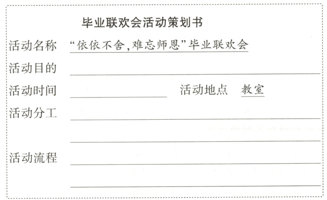 1. 请你根据主题将毕业联欢会活动策划书补充完整。(4分)