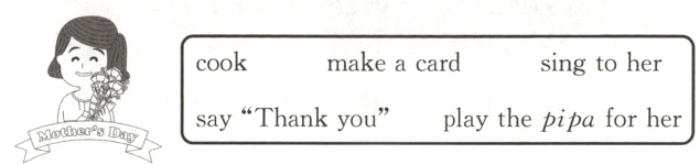 Mother’s Day is coming. I’ll make a card for my mother. I’ll say “Thank you” to her. I’ll sing a song to her. I’ll cook dinner for her. I’ll play the pipa for her.(答案不唯一)