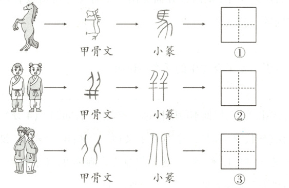 1. 看图形和汉字的演变过程,在田字格中写出这个汉字。(3分)