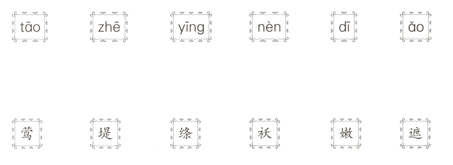 tāo——绦 zhē——遮 yīng——莺 nèn——嫩 dī——堤 ǎo——袄
