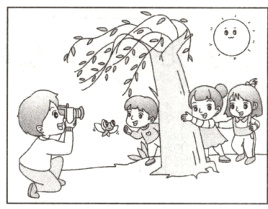 示例:春天来了,小红、小芳、小明和小刚四个小伙伴一起去找春天。他们来到公园里,看到柳树柔软的枝条随风摇摆。小刚说:“看,春天就在这里呢! 我们一起来和柳树照相吧!”小芳说:“好呀,我们一起来照相。”小明、小红、小芳一起来到柳树旁,小刚拿起了相机,把好朋友们快乐的笑脸拍了下来。