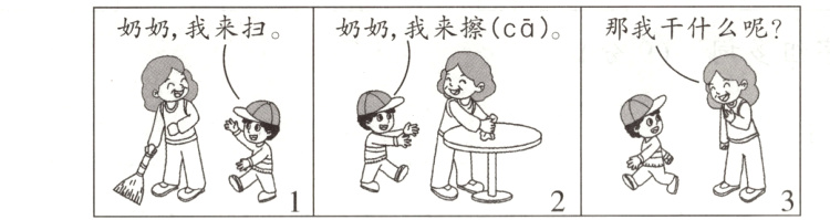 仔细观察每幅图,想一想:奶奶在干什么?宁宁对奶奶说了什么?他又会怎么做呢?用几句话写下来。(不会写的字用拼音代替)